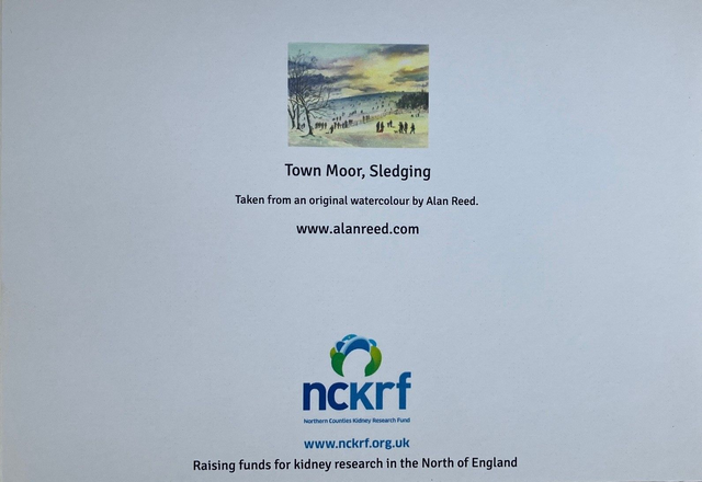 The artwork for this card was very kindly provided by Alan Reed (www.alanreed.com) a renowned artist from the North East of England. The original watercolour was inspired by a morning sledging on Town Moor with his children and grandchildren. The card is A6 sized (105 x148 mm) and is folded at the side.